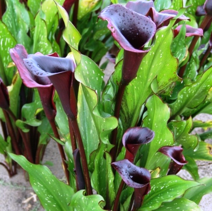 Небольшие темно-бордовые цветы формируются в период с июля по август на высоких цветоносах до 70 см. В теплых условиях культура начинает источать приятный аромат с ярко выраженными нотками ванили. Не прихотлив в выращивании. Подходят для выращивания в горшках. Интересный факт: Каллы растут в периодически высыхающих и затапливаемых районах – они могут пережить засуху благодаря корневищам и возрождаются, когда появляется достаточно воды. ПОСАДКА И УХОД. Каллы можно выращивать как горшечную культуру, так и садовую. Для посадки каллы подойдет притененный участок. Идеальный вариант, место под негустыми кронами деревьев. Чтобы было достаточно светло, а солнечные лучи не обжигали листьев. Очень эффектно смотрятся каллы, рядом с искусственным водоемом. Отлично цветет и растет только в тепле, где температура не ниже 18°C, самая оптимальная температура 22-23°C. Не переносит сквозняков. Цветоносы этого растения высокие, которые идут прямо от низа растения. На открытом воздухе это прекрасное растение цветет 1 месяц, а в закрытом помещении — 14 дней. Осенью растения сбрасывают листья. На зиму клубни каллы нужно выкопать и хранить в непромерзаемом помещении.